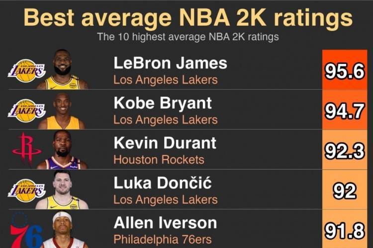 2K历史平均评分Top10:詹姆斯95.6榜首 科比第二